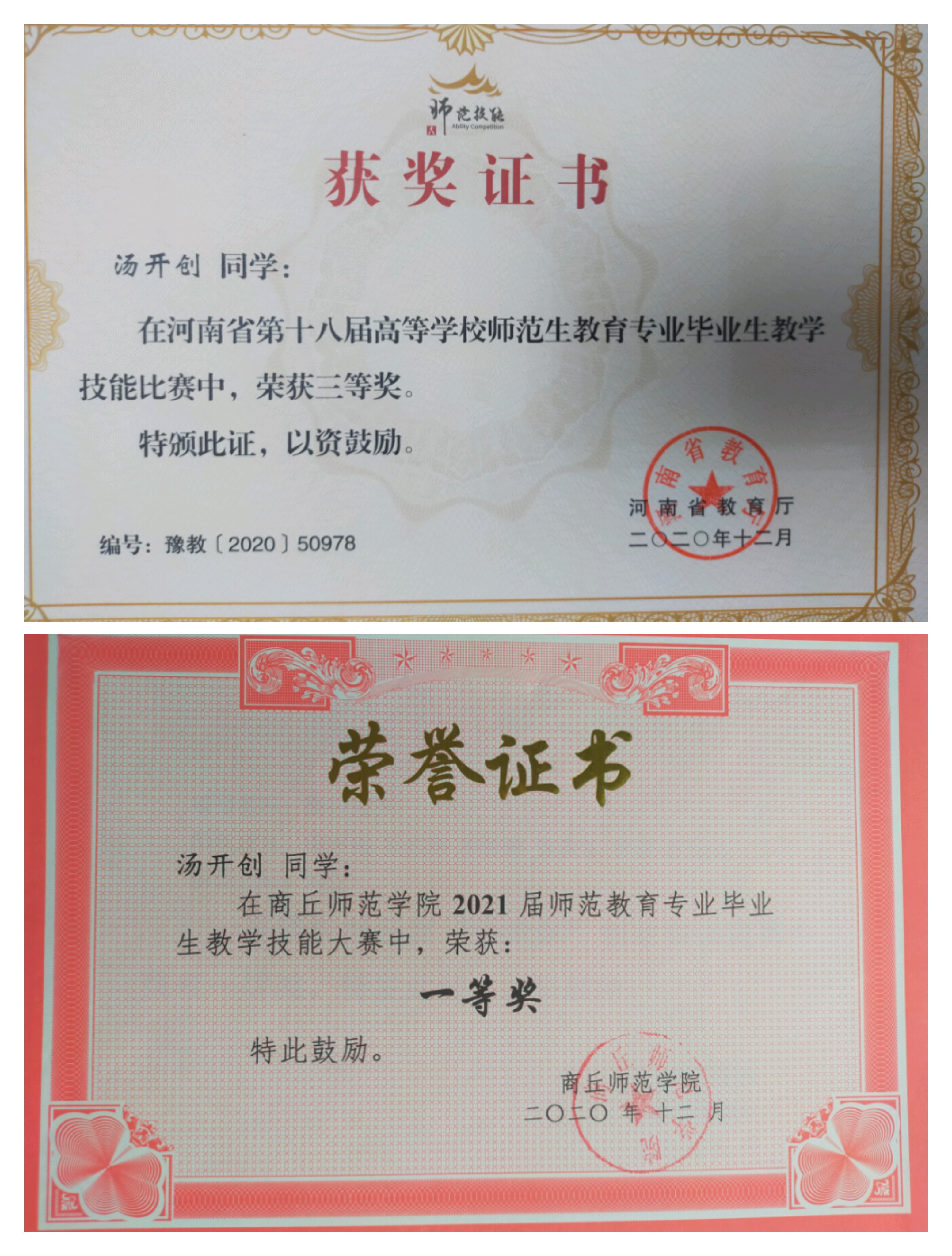 欲穷千里目,更上一层楼。身为一名师范生,他深知说课和讲课能力对一名师范生的重要性。大三校内实习期间,他认真把握机会,争取到了去学校参加比赛的名额,荣获了师范生教学技能大赛一等奖,并凭借校级一等奖得到了去参加省赛的机会。从学校比赛结束到省级比赛只有短短十几天,时间很紧,但他丝毫没有慌张,沉着冷静,最终凭借着自身能力荣获了河南省第十八届高等学校毕业生师范技能教学大赛三等奖。此外,他还积极投身志愿服务,在校期间多次参加暑期三下乡社会实践活动,帮助社区和身边的人做一些力所能及的事,并于2020年获得了暑期三下乡校级立项荣誉。