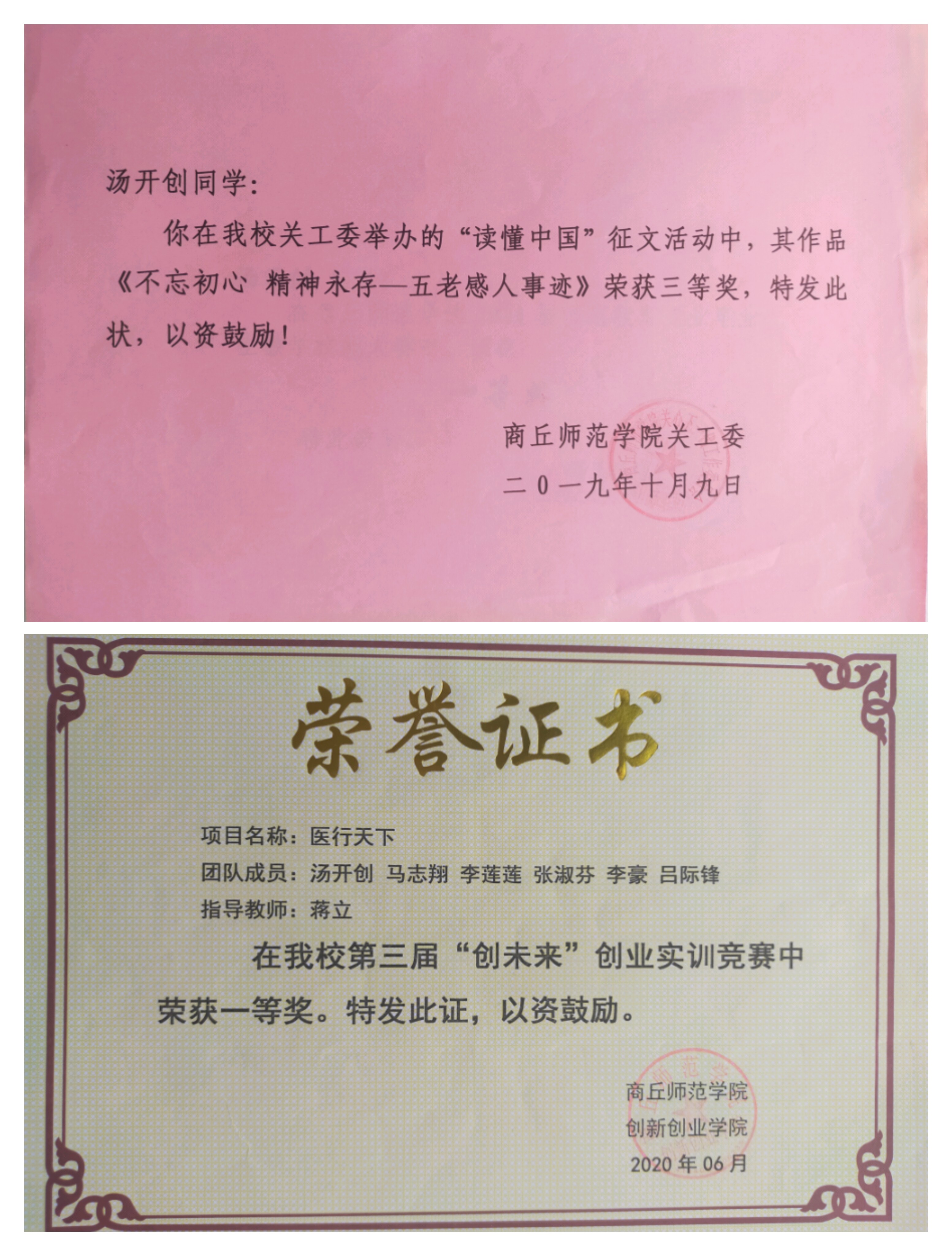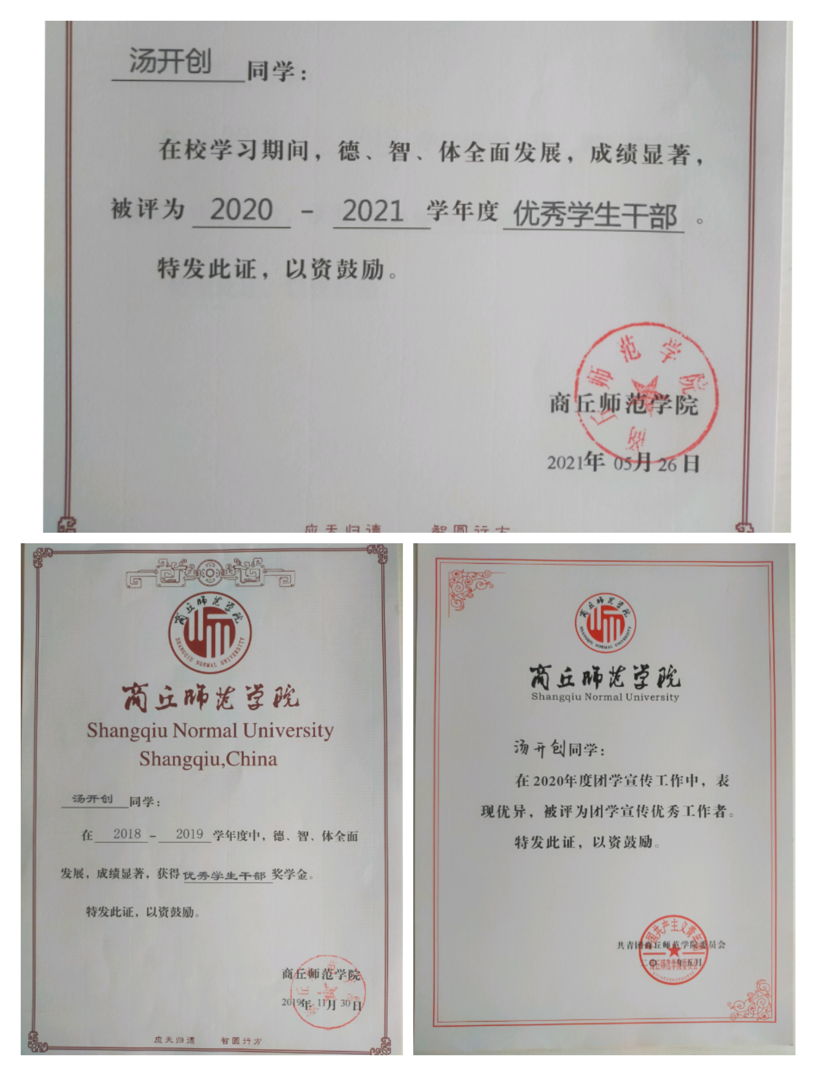 千锤万凿出深山,烈火焚烧若等闲。汤开创尊重他人,珍惜时间,不放过每一次锻炼自己的机会。大二期间他积极响应学校号召,组织带领团队参加了创新创业大赛。在备战比赛期间,他积极与团队成员进行沟通,每次团队遇到困难时他总是第一个站出来,献言献策,身体力行,在他的带动下,整个团队的成员都受到了鼓舞,勇于面对困难。就这样,在一次又一次的努力与奋斗中,他与团队成员都在慢慢的成长,最终他带领团队荣获商丘师范学院第三届“创未来实训比赛一等奖”。同时,汤开创还爱好写作,平时喜欢读书,提升自己的思想水平,大学期间他参加了学校关工委举办的“读懂中国”征文活动并荣获三等奖。