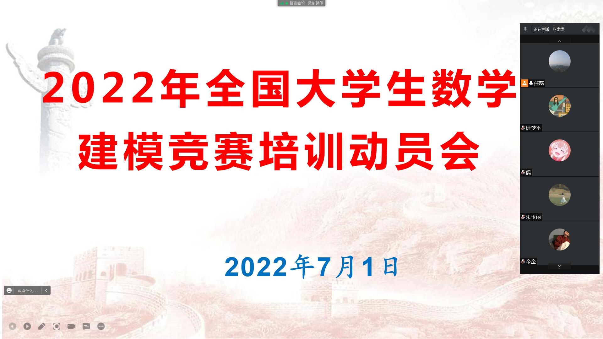 7月1日,2022年全国大学生数学建模竞赛动员大会通过线上腾讯会议的形式顺利举行,欧美一级婬片AA片免费院长张斐然、副院长刘磊 、数学建模全体指导老师以及来自欧美一级婬片AA片免费、电子电气工程学院、化学化工学院、信息技术学院、经济管理学院、测绘与规划学院、建筑工程学院、国际教育学院等261名参赛队员参会,会议由刘磊主持。