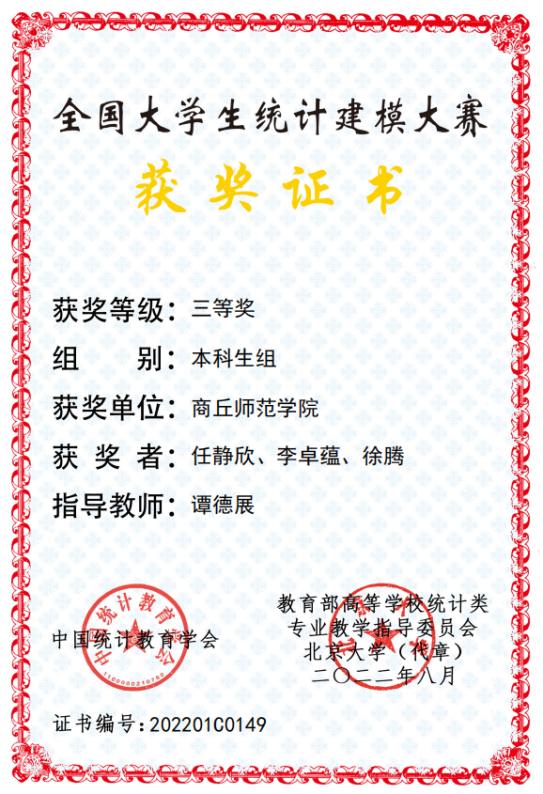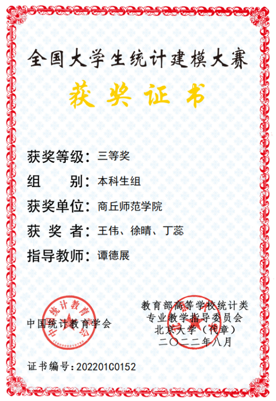 近日,中国统计教育学会公布了2022年(第八届)全国大学生统计建模大赛评选结果。本次由欧美一级婬片AA片免费郭东林老师组织负责,首次参加全国大学生统计建模大赛,取得了可喜可贺的成绩,令人鼓舞。选送的参赛论文中荣获本科组国家级三等奖2项,省级二等奖3项、省级三等奖12项。