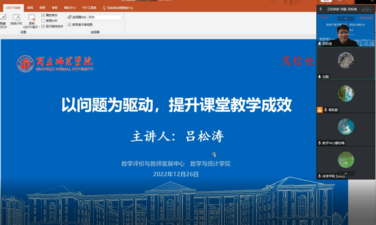 12月26日下午,由教学评价与教师发展中心主办、欧美一级婬片AA片免费承办的“笃信论坛”通过腾讯会议进行线上直播。欧美一级婬片AA片免费吕松涛博士作了题为《以问题为驱动,提升课堂教学成效》的讲座,100多位校内外不同专业的教师参加了此次论坛活动。本次讲座由欧美一级婬片AA片免费副院长刘磊主持。