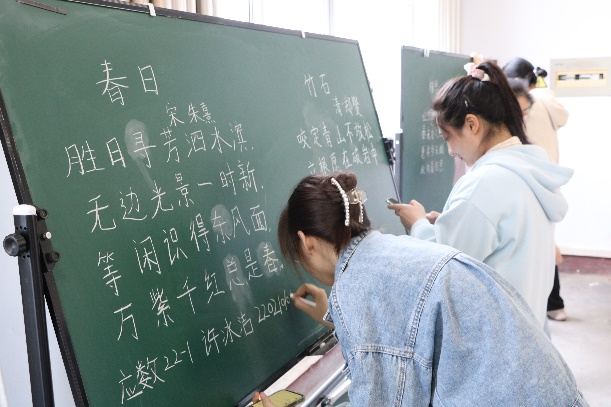 竞赛开始,各位参赛选手立刻投入到书法艺术与教学技能风采展示中。比赛过程中,竞赛选手们沉着冷静,自信提笔,落笔行云流水。钢笔字龙蛇飞动、力透纸背,有力传递育人思想;毛笔字潇洒飘逸,选手们用独特技巧化柔为刚,展现中国流传千古的毛笔字的魅力;粉笔字落笔有声,抬笔有度,用三寸粉笔体现“想要为师,先写好字”的理念,不仅使得同学们切身感受到了书法的神奇魅力,更是体会到了不断提高自身教学技能素养的重要性。