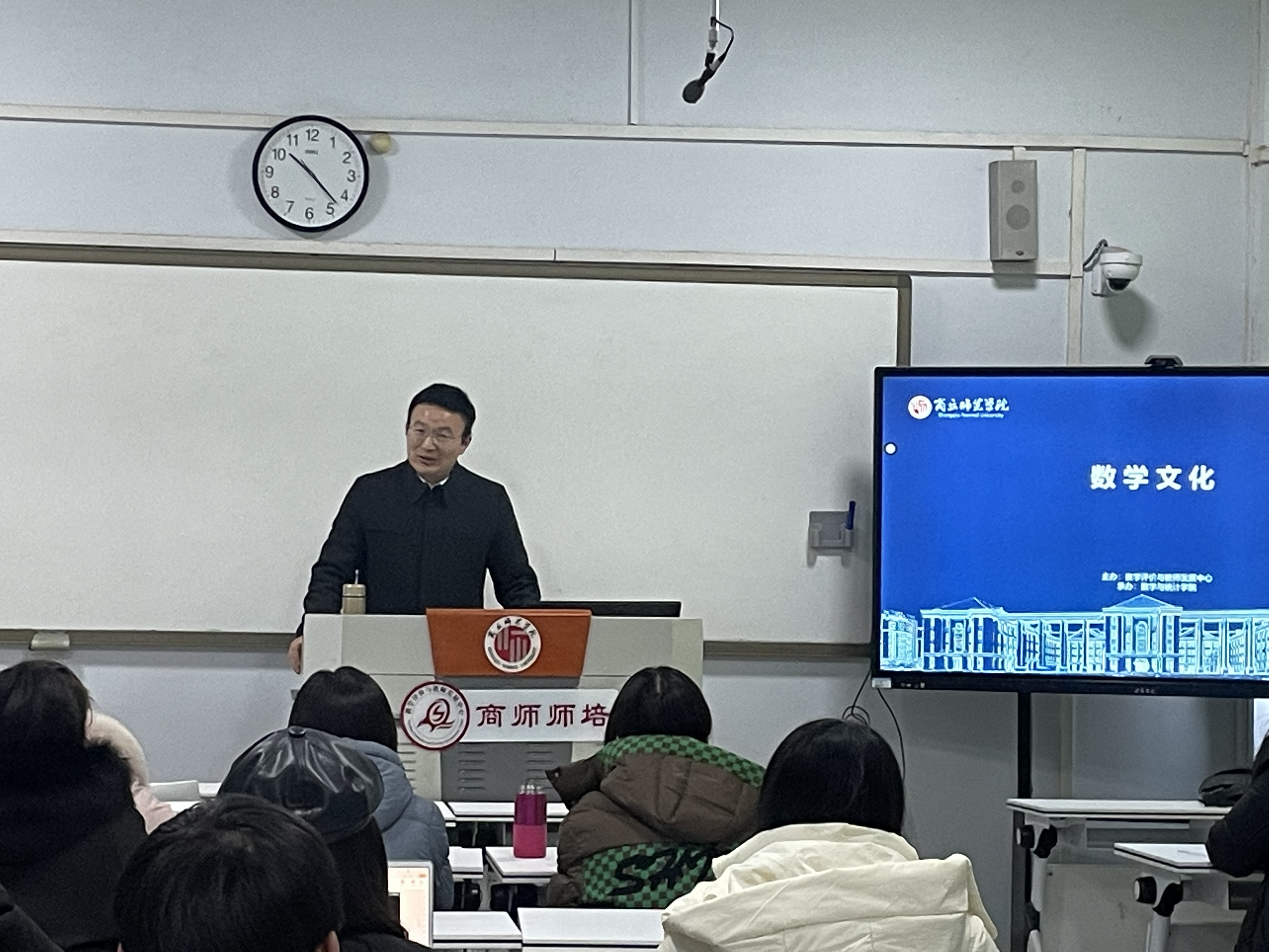 荆天首先介绍了数学的历史起源、数学文化的定义,他提出要从数学的角度看问题的出发点,解决问题和总结工作时,要运用逻辑推理的意识和能力,对所从事的工作,可以做到合理的量化和简化;接着,荆老师通过讲解学术和生活中的例子,让在场的老师感受到数学的魅力,并让大家积极地参与了讨论;最后,荆天引用数学大家华罗庚的名言,以及诺贝尔经济学奖获得者阿尔文·罗思的稳定匹配理论,强调学习数学知识的重要性。