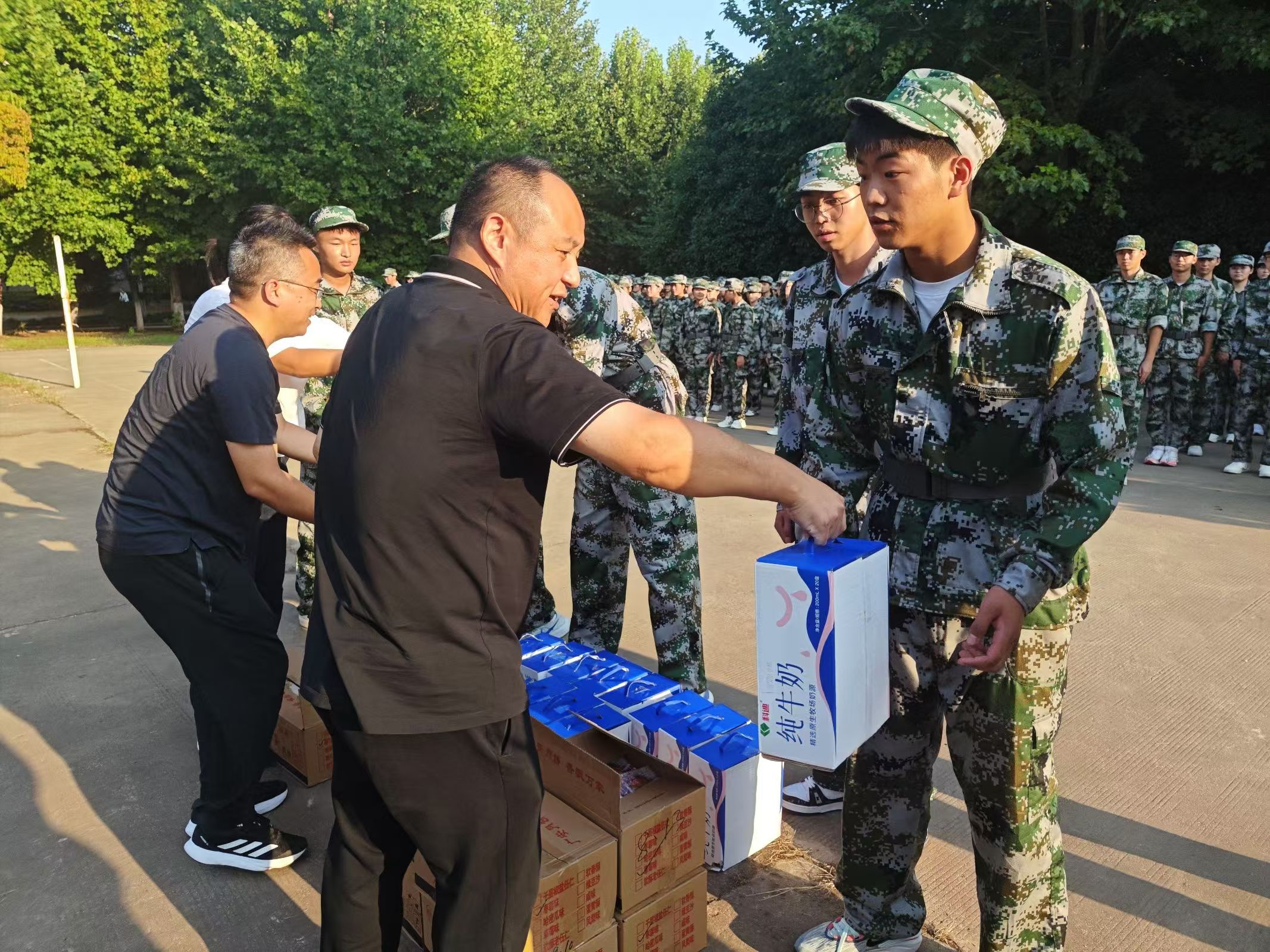 首先,学院领导老师们亲切地与教官和学生们握手问候并对教官们的辛苦付出表示了由衷的感谢。接着,张斐然院长对同学们刻苦训练的表现和昂扬的精神面貌给予了高度赞扬,并鼓励他们在接下来的日子里继续发扬不怕吃苦、勇于拼搏的精神,圆满完成军训任务。最后,领导老师们依次为24级新生们发放了精心准备的牛奶和月饼,与同学们一起共享甜蜜,共度佳节。