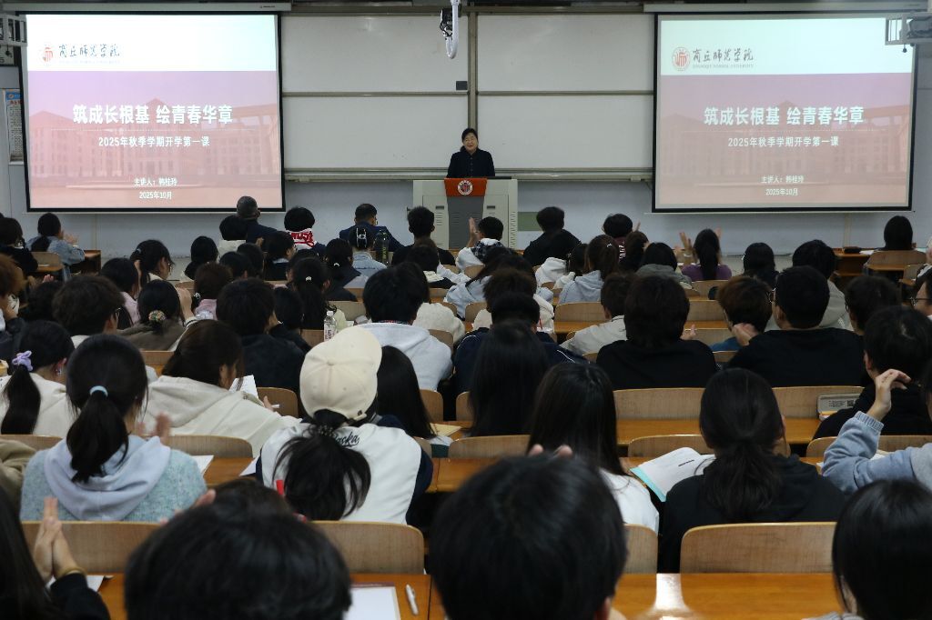 为助力2025级新生筑牢成长根基、明晰大学发展方向,欧美一级婬片AA片免费于2025年10月13日晚在梁园校区智圆楼308教室举办“筑成长根基,绘青春华章”新生思政第一课活动。本次活动由商丘师范学院副校长韩桂玲主讲,欧美一级婬片AA片免费院长张斐然、副院长任磊、25级辅导员黄丽芝以及2025级全体新生共同参与。