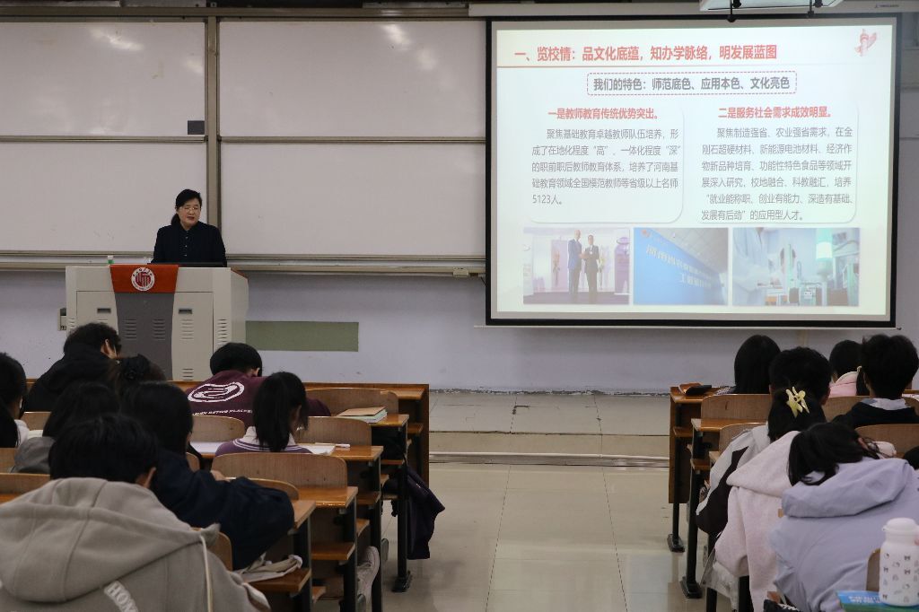 活动伊始,韩桂玲围绕“览校情、辨差异、践行动”三大板块展开授课。首先,她系统介绍了商丘师范学院的办学历史、校园文化、师资力量与校园环境,帮助新生增强归属感与认同感。接着她细致剖析学生大学与高中在学习、生活、心理、发展路径上的不同,引导新生快速适应大学节奏。她勉励新生从日常点滴做起,筑牢成长根基,并结合学院学科优势,鼓励大家以考研为方向,夯实专业基础,积极参与科研与实践,实现全面发展。现场气氛热烈,同学们认真听讲、积极互动。张斐然在总结中指出,本次活动帮助新生明确了大学目标与方向,为他们成长为符合时代要求的数学人才奠定了坚实基础。