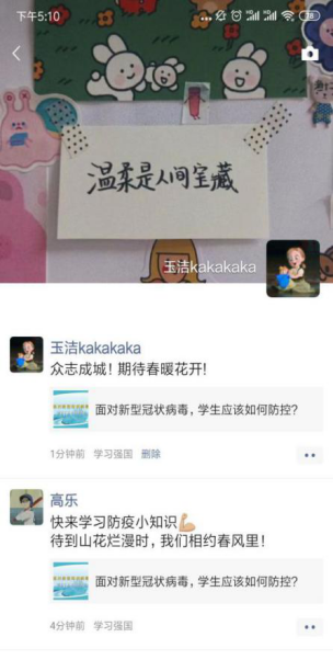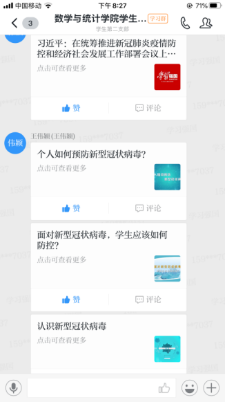 同时,支部党员同志们通过学习强国建立的支部群,广泛探讨对疫情的更多想法看法和自己的观点,以及自己对目前疫情防控的观点及为中国、武汉加油的祝福。