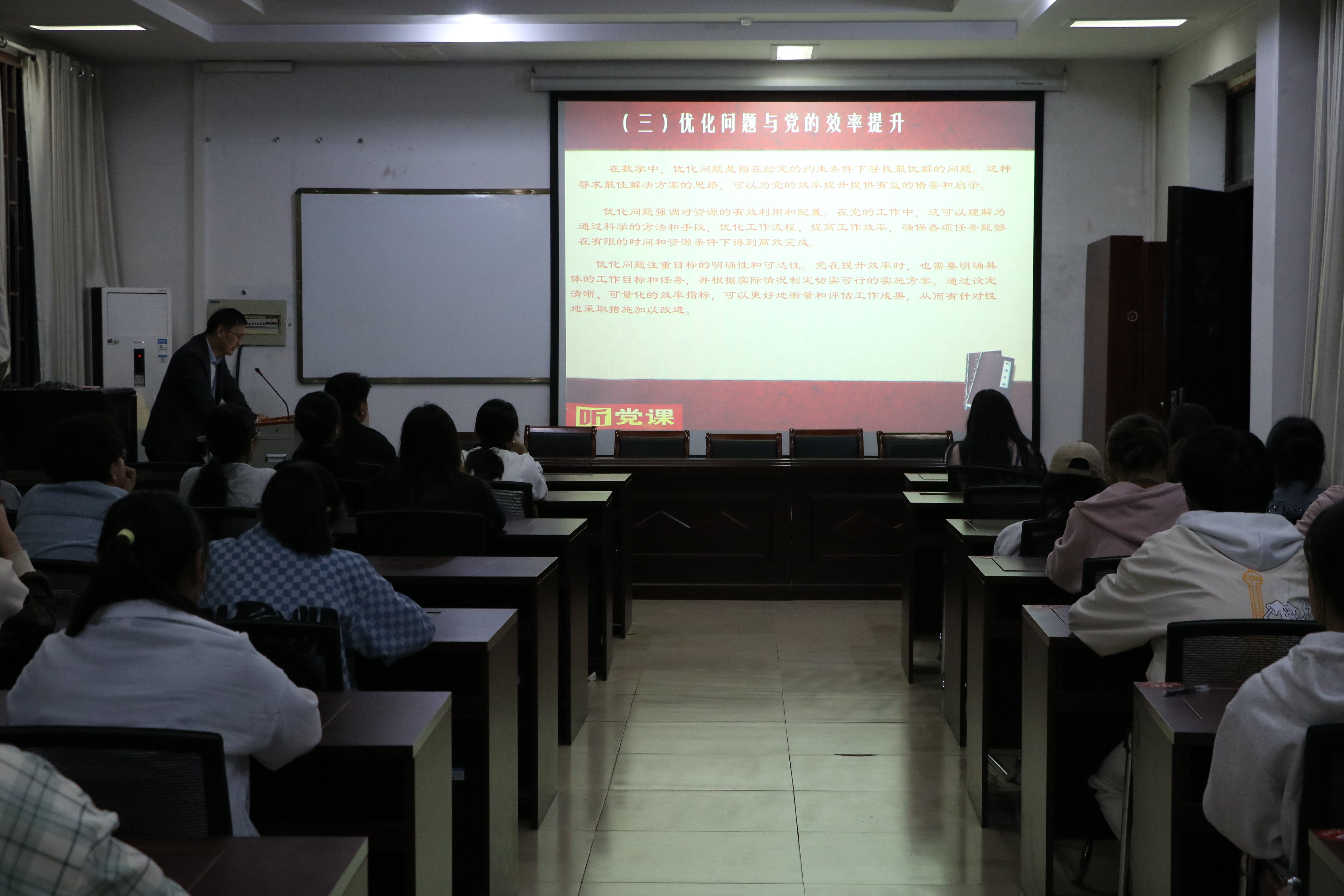 张院长分别从数学与逻辑思维、数学与理想信念和数学与社会发展三方面讲述本次党课。首先,他通过对比数学公理化方法和党的基本理论,讲述了数学证明过程和党决策制定的相似点,帮助同学们理解二者之间的联系。接着,他指出数学的确定性和普遍性与理想信念的关系,鼓励同学们借助数学思维分析解决问题,不断坚定与践行自身理想信念和目标。最后,他向同学们列举了数学与5G技术、人工智能等例子,展示了数学在生活以及科技领域中的应用,使同学们深刻认识到数学在推动社会发展方面的重要价值。