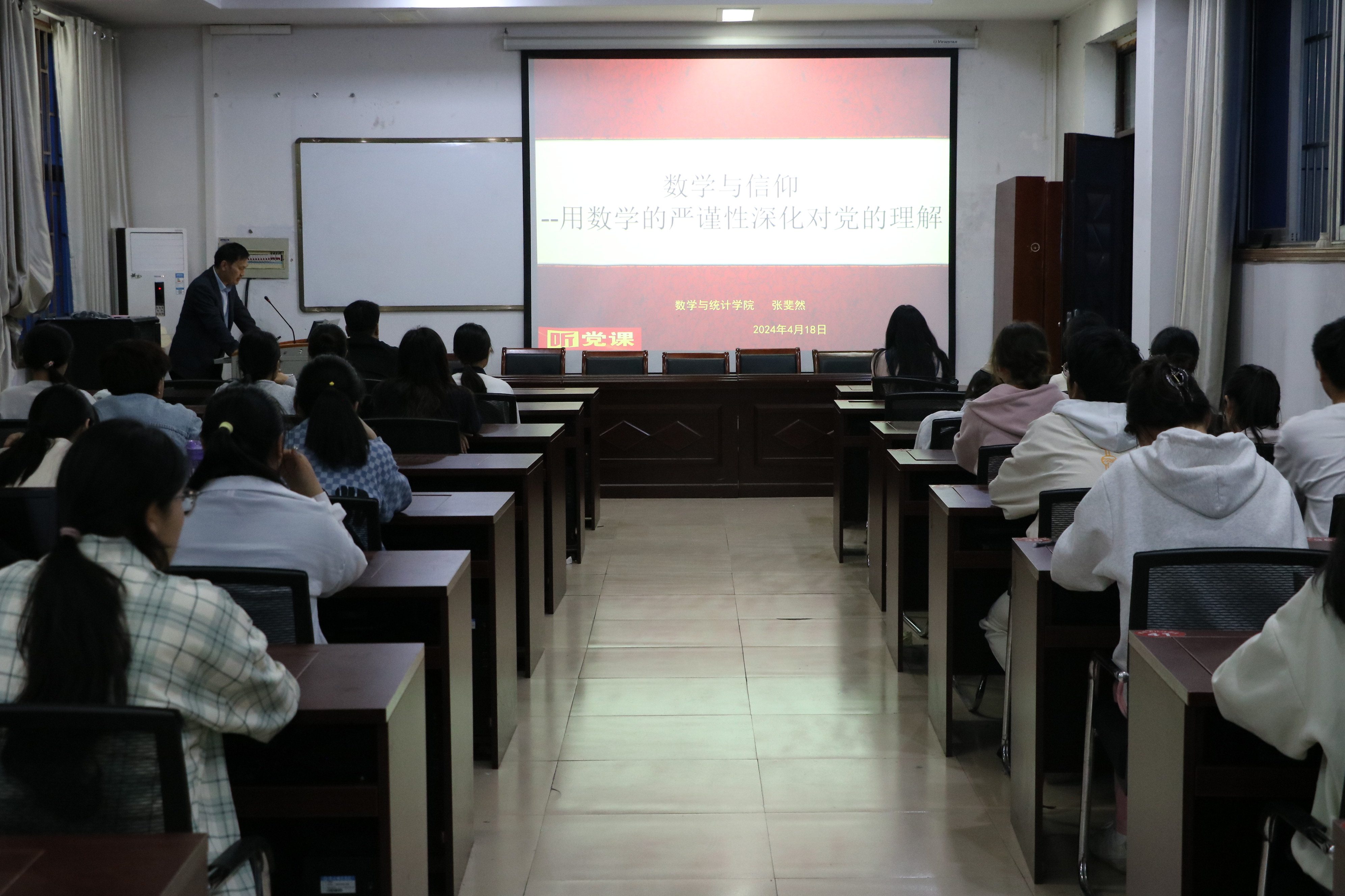 为加强对入党积极分子的思想政治教育,提高其对党的认识和理解,进一步坚定理想信念,欧美一级婬片AA片免费于4月18日在办公楼208教室开展了以“数学与信仰——用数学的严谨性深化对党的理解”为主题的党课培训。本次党课由欧美一级婬片AA片免费院长张斐然主讲,全体中级入党积极分子参加。
