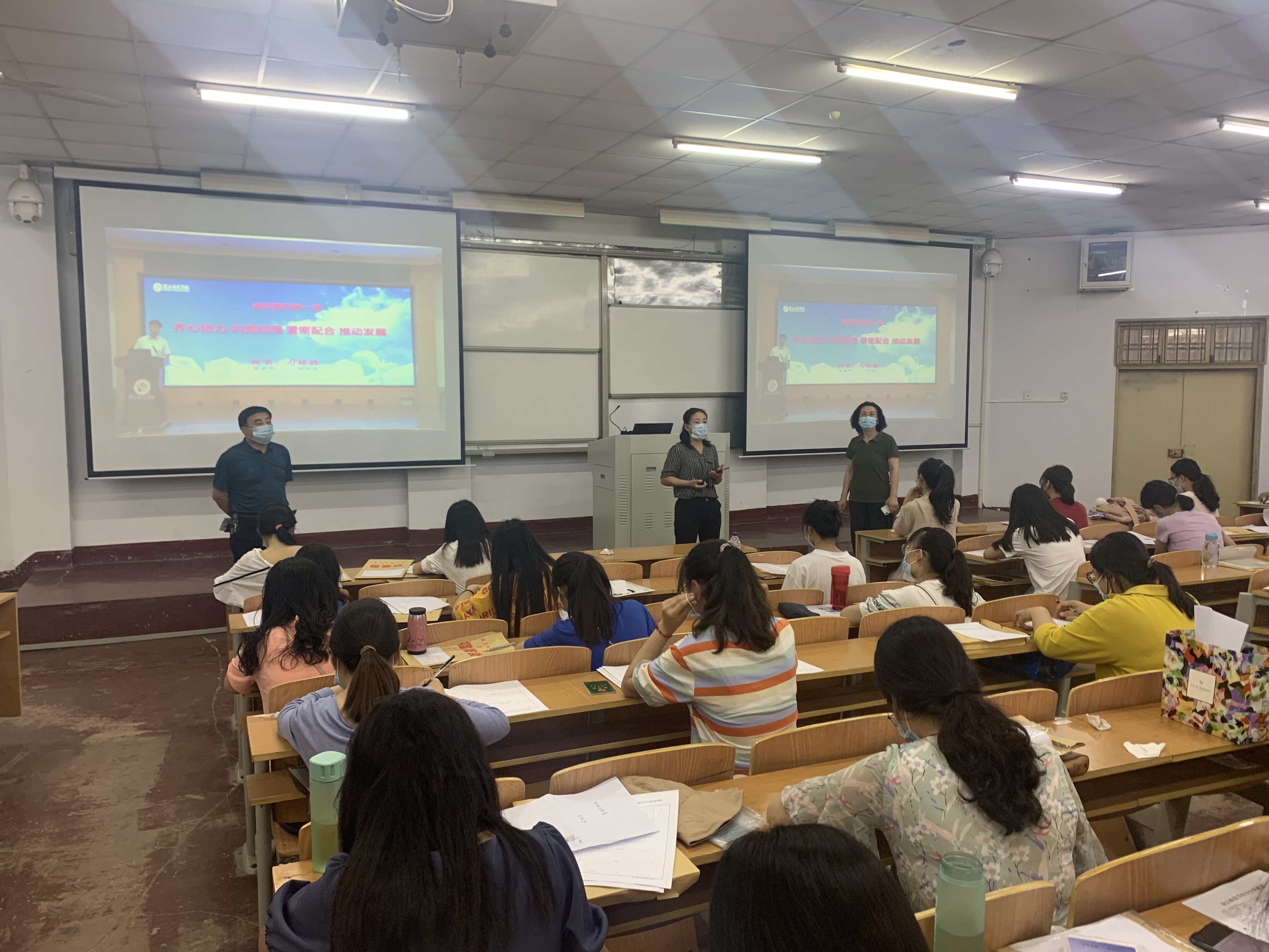 上午八点三十分,返校第一课正式开始。校领导们依次发表了讲话,师生代表也进行了发言。其中党委书记介晓磊以《弘扬爱国主义精神,展现青年学生风采》为题展开深入讲述。校长司林胜以《齐心协力,共克时艰,紧密配合,推动发展》为题,围绕学校整体工作、学生管理、教学安排等,就学校整体工作进行部署。副校长郭文佳以《扎实做好疫情防控工作,确保学校开学安全》为题,介绍学校疫情防控的整体安排和具体措施。教师代表刘培培,学生代表张沈也依次进行了发言。同时全体观看师生还齐唱了由音乐学院创作的歌曲《武汉,我们和你在一起》。