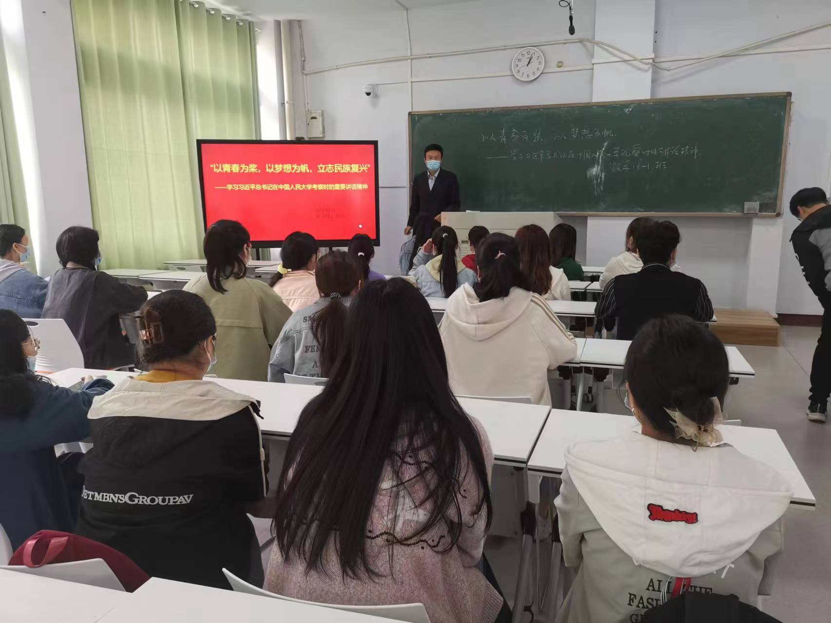 在五四青年节即将到来之际,习近平总书记到中国人民大学考察调研并发表重要讲话,充分体现了对教育工作的高度重视、对广大青年的殷切期望。主题班会上,班主任领学了习近平总书记考察中国人民大学时重要讲话,播放了习近平总书记在中国人民大学走访的相关新闻视频材料,并结合班级实际情况,围绕理想信念教育、爱国主义教育等方面鼓励学生们牢记总书记教诲,立志复兴,不负韶华。
