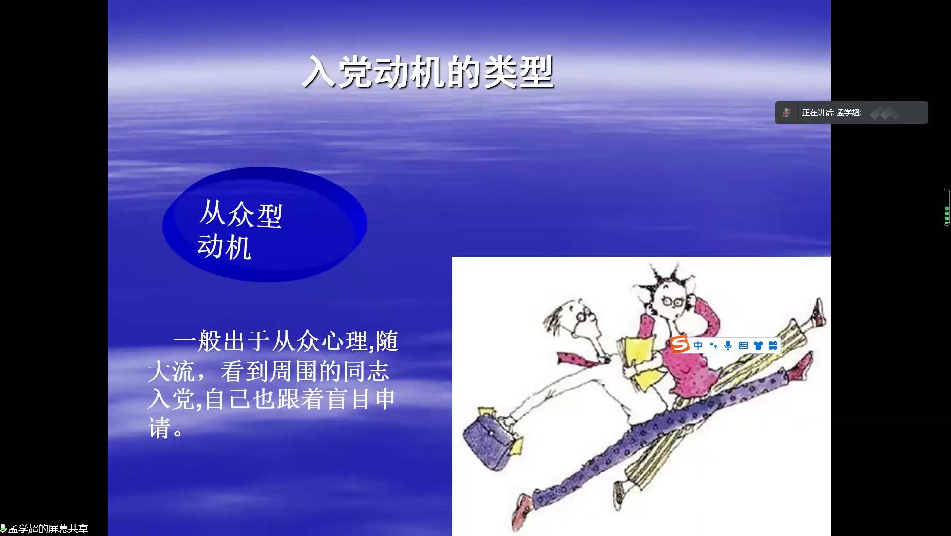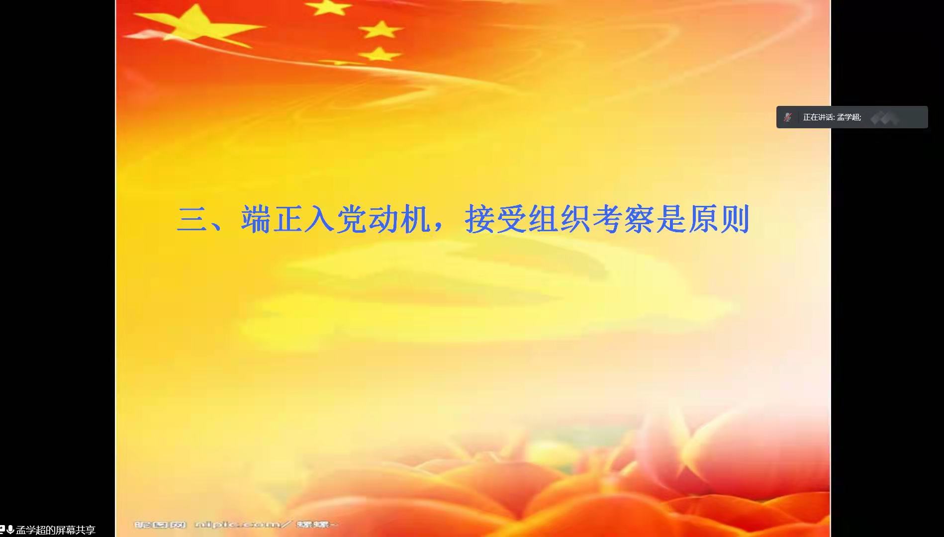 为端正入党积极分子的入党动机,欧美一级婬片AA片免费于3月28日晚线上召开了以“端正入党动机,争取早日加入党组织”为主题的中级入党积极分子党课培训会议。本次党课由党委书记孟学超主讲,全体中级入党积极分子参加。