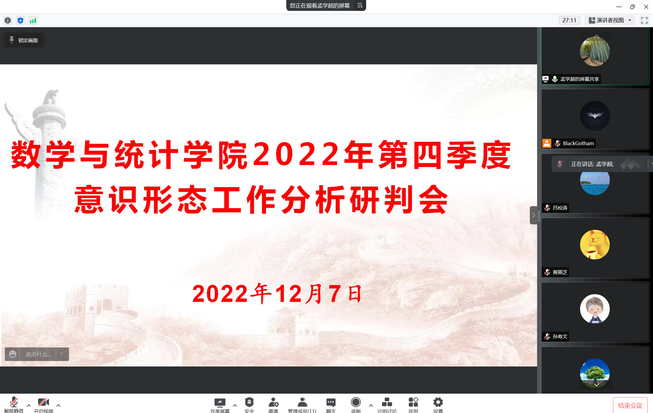 会上,参会人员围绕学校党委宣传部《关于召开2022年第四季度意识形态工作分析研判会的通知》文件中安排的主题,结合自身工作实际,对存在的风险和改进措施进行了汇报,针对学院当前的意识形态工作进行了分析研判。