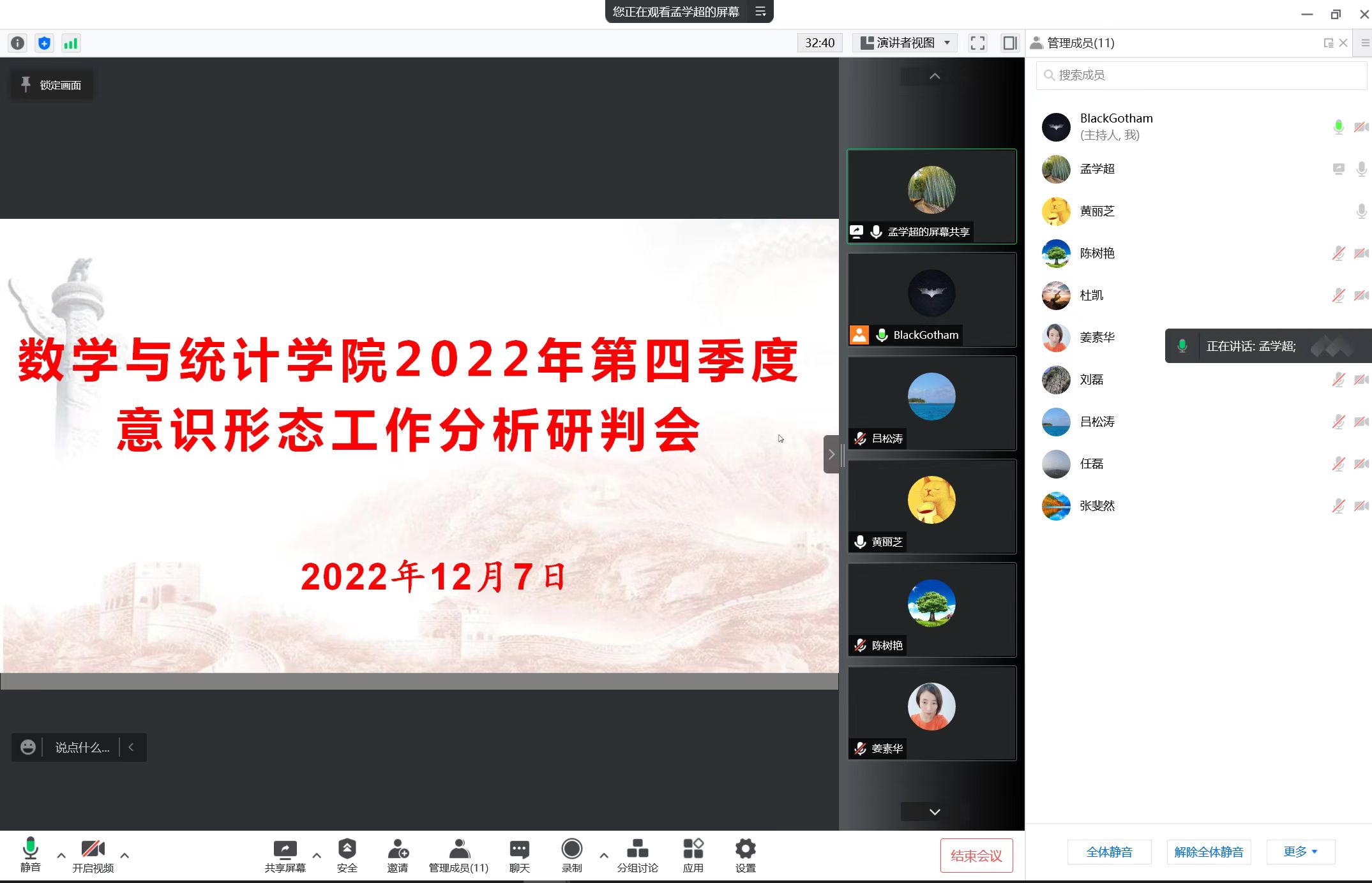 2022年12月7日上午,欧美一级婬片AA片免费通过腾讯会议召开2022年第四季度意识形态工作分析研判会,学院党委委员、党支部书记、全体辅导员参加了此次会议,会议由党委书记孟学超主持。