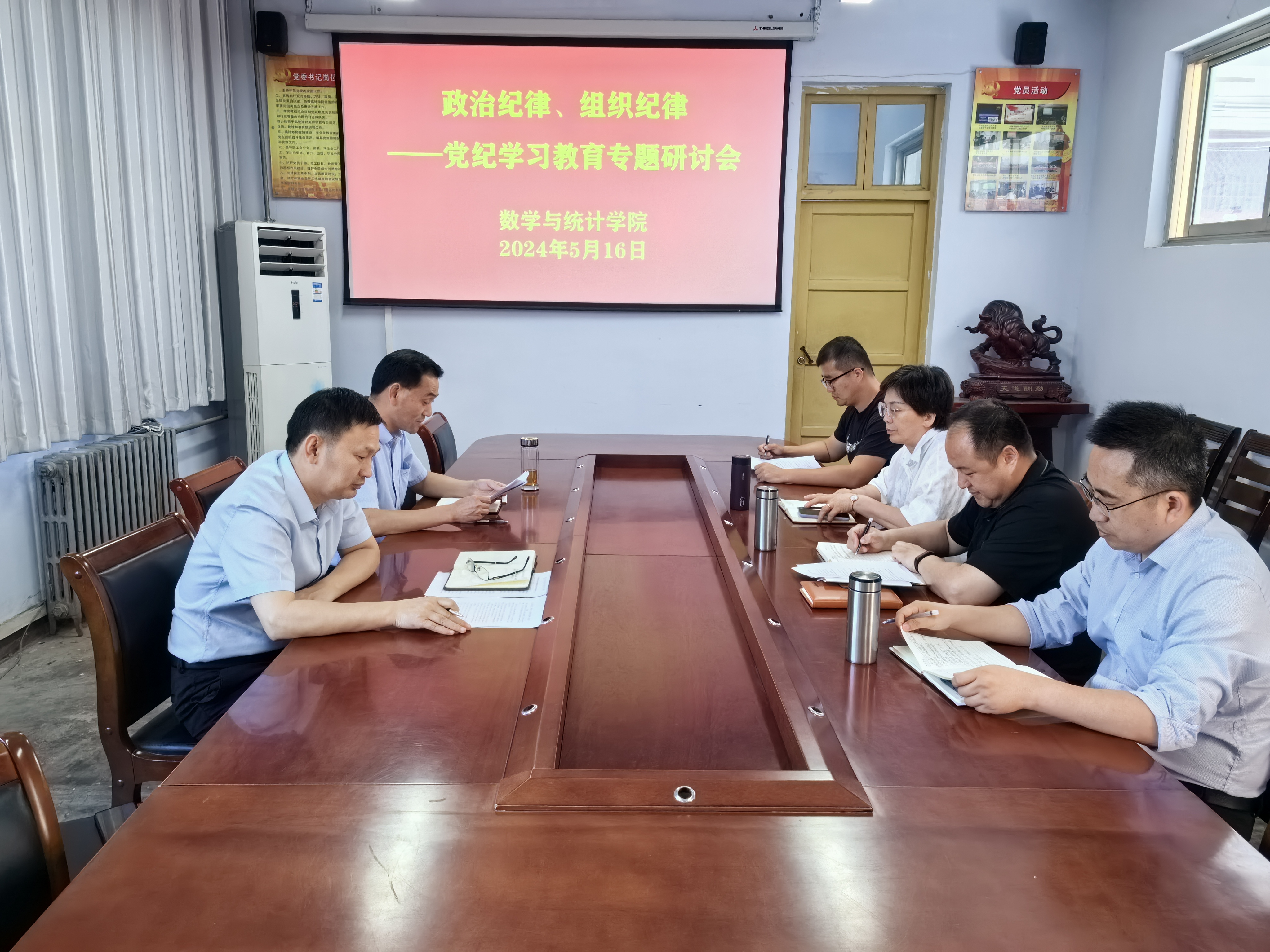 2024年5月16日,欧美一级婬片AA片免费党委理论学习中心组在数学楼204党员活动室举行党纪学习教育第一次专题学习研讨会,学院党委委员参加会议。会议由学院党委书记孟学超主持。
