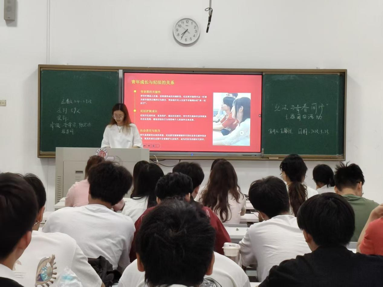 活动过程中,团支书王馨悦以PPT讲解校园案例剖析纪法违规后果。随后,同学们围绕“纪法与青春”讨论,结合学习生活分享理解。此外,团支书王馨悦还组织开展知识竞赛,通过小组抢答展现学习成果。最后,同学们观看了警示教育片,教育片中的真实案例让同学们感到震撼警醒,让他们深刻意识到要在今后的生活中坚决不做违纪违法的事情。
