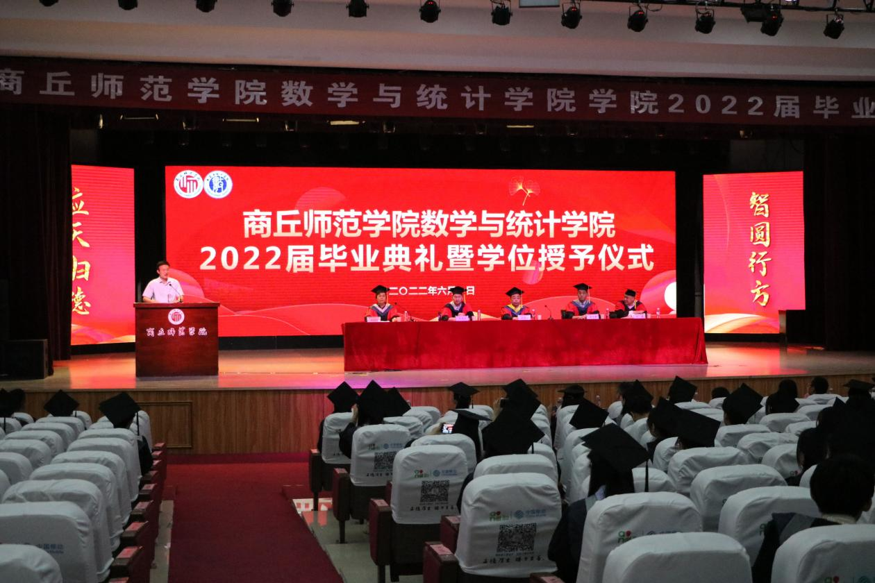 初夏时节,骊歌奏响。6月1日上午,数学与统计学院在睢阳校区大礼堂隆重举行2022届毕业典礼暨学位授予仪式,副校长徐茂田出席,学院领导班子成员、全体辅导员、毕业班班主任、教师代表、及2022届在校生参加,学院党委副书记陈树艳主持毕业典礼暨学位授予仪式。